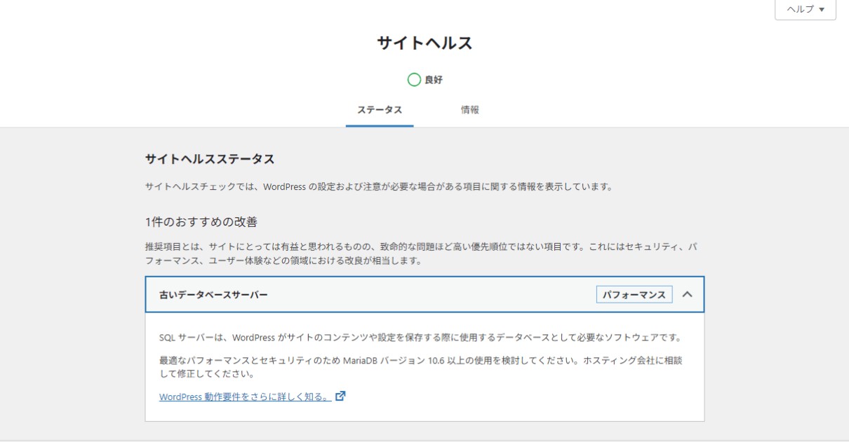 WordPressをバージョン6.9にアップグレードした後に、ダッシュボードのサイトヘルスを確認したら、「古いデータベースサーバー」という1件のおすすめの改善項目がありました。